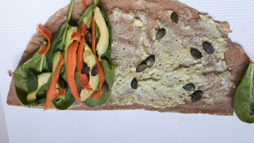 Midi : Wrap de Galette de sarrasin : tartiner la galette avec un fauxmage végétal aux tomates séchées ou autres, découper un avocat y déposer des tranches, intégrer des bâtonnets de carottes, de concombre, d’oignons rouges et saupoudrer de gomasio et graines. Rouler la galette.